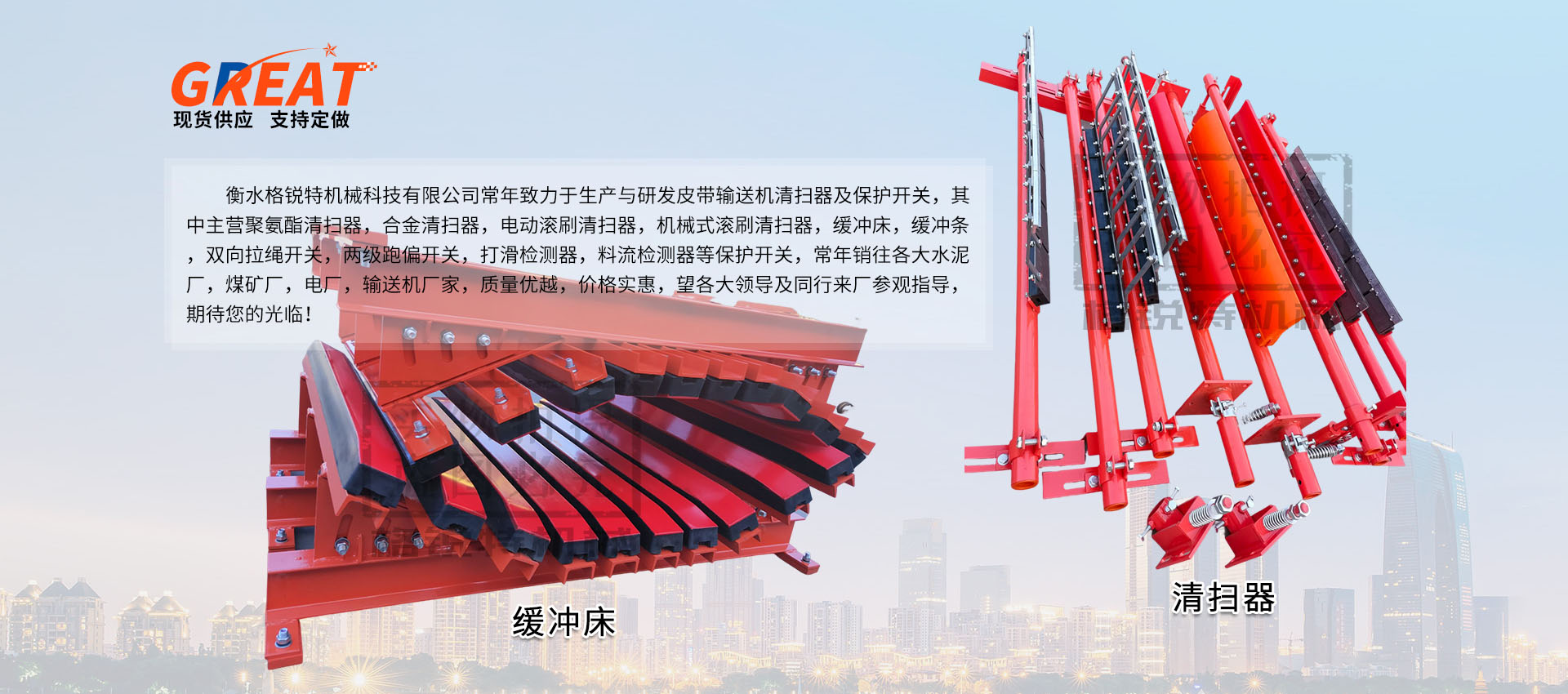 衡水格銳特機(jī)械科技有限公司常年致力于生產(chǎn)與研發(fā)皮帶輸送機(jī)清掃器及保護(hù)開關(guān),其中主營聚氨酯清掃器,合金清掃器,電動(dòng)滾刷清掃器,機(jī)械式滾刷清掃器,緩沖床,緩沖條,雙向拉繩開關(guān),兩級(jí)跑偏開關(guān),打滑檢測器,料流檢測器等保護(hù)開關(guān),常年銷往各大水泥廠,煤礦廠,電廠,輸送機(jī)廠家,質(zhì)量優(yōu)越,價(jià)格實(shí)惠,望各大領(lǐng)導(dǎo)及同行來廠參觀指導(dǎo),期待您的光臨!!!